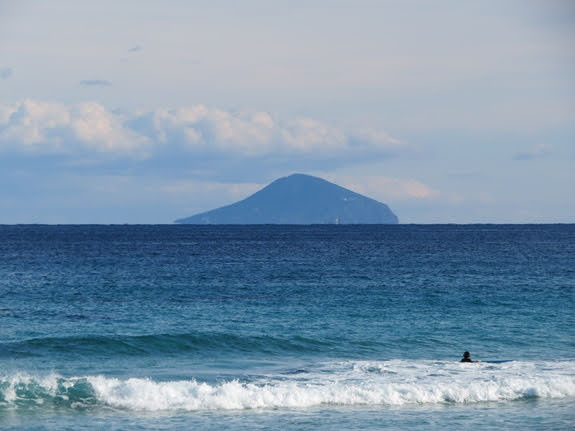 下田市白浜が近づくと国道沿いにあるのが尾ヶ崎ウイングというPA。熱海からだと初島や伊豆大島ぐらいしか目視できませんが、ここからだと伊豆諸島の大よそを眺めることができます。この日は残念ながら雲が多かったのですが、それが逆にイイ感じの雰囲気を醸し出してくれました。そしてたぶんこれはブーケンビリアでしょうか。こんな時期でも咲いてるって・・伊豆半島ってホント暖かいんですね。